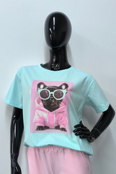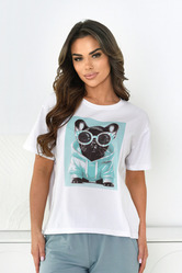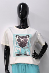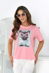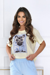 T-shirt damski z modnym nadrukiem pieska. Model o prostym kroju zapewnia komfort noszenia i swobodę ruchów.