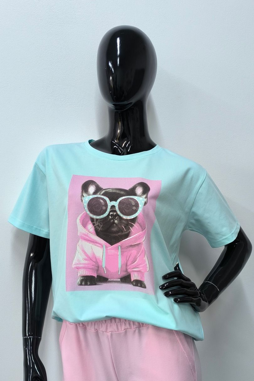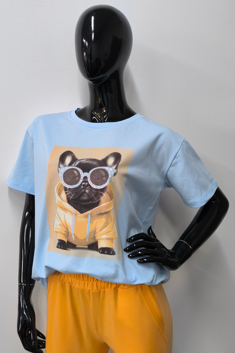 T-shirt damski z modnym nadrukiem pieska. Model o prostym kroju zapewnia komfort noszenia i swobodę ruchów. Wykonany z wysokiej jakości dzianiny bawełnianej z domieszką elastanu, dzięki czemu jest miękki, oddychający i lekko elastyczny. Idealny wybór do codziennych i sportowych stylizacji. Świetnie komponuje się zarówno z jeansami, legginsami jak i spodenkami!