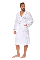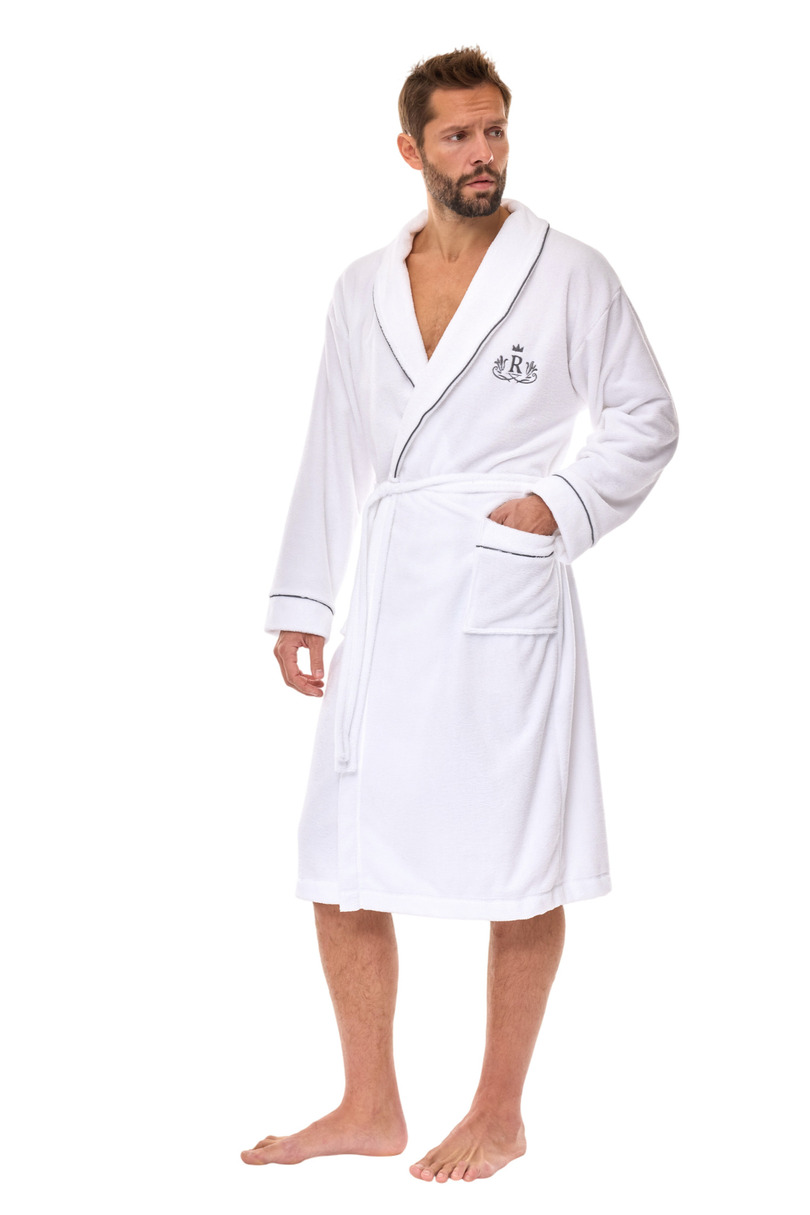 Szlafrok męski 2523 to synonim luksusu i wygody dla mężczyzn ceniących elegancki styl nawet w domowym zaciszu. Wykonany z wysokiej jakości tkaniny będącej połączeniem naturalnego bambusa i bawełny, zapewnia nie tylko miękkość, ale też doskonałą oddychalność oraz właściwości antybakteryjne. Klasyczny krój z kołnierzem szalowym, wykończenia z kontrastową lamówką i haftowane logo nadają mu wyjątkowego charakteru. Szlafrok wyposażono w praktyczne kieszenie i pasek w talii. Dostępny w dwóch kolorach: elegancka biel i stylowy granat.