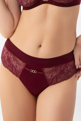 Biustonosz K956 w kolorze głębokiego bordo to wyrafinowana propozycja dla kobiet ceniących elegancję i wygodę. Miseczki typu full-cup wykonane zostały z misternie haftowanej koronki o geometrycznym wzorze, która pięknie kontrastuje z cielistym podszyciem, eksponując detale. Stabilna konstrukcja z fiszbinami oraz szerokie, wygodne ramiączka gwarantują doskonałe podtrzymanie nawet przy większym biuście. Złote kółeczka i satynowa kokardka z przodu dodają wyjątkowego charakteru. Idealny zarówno na co dzień, jak i na wyjątkowe okazje.