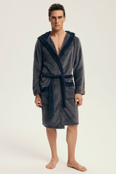 Szlafrok męski z kapturem, kontrastowym wykończeniem i paskiem. Wygodny, ciepły i stylowy – idealny do codziennego użytku.