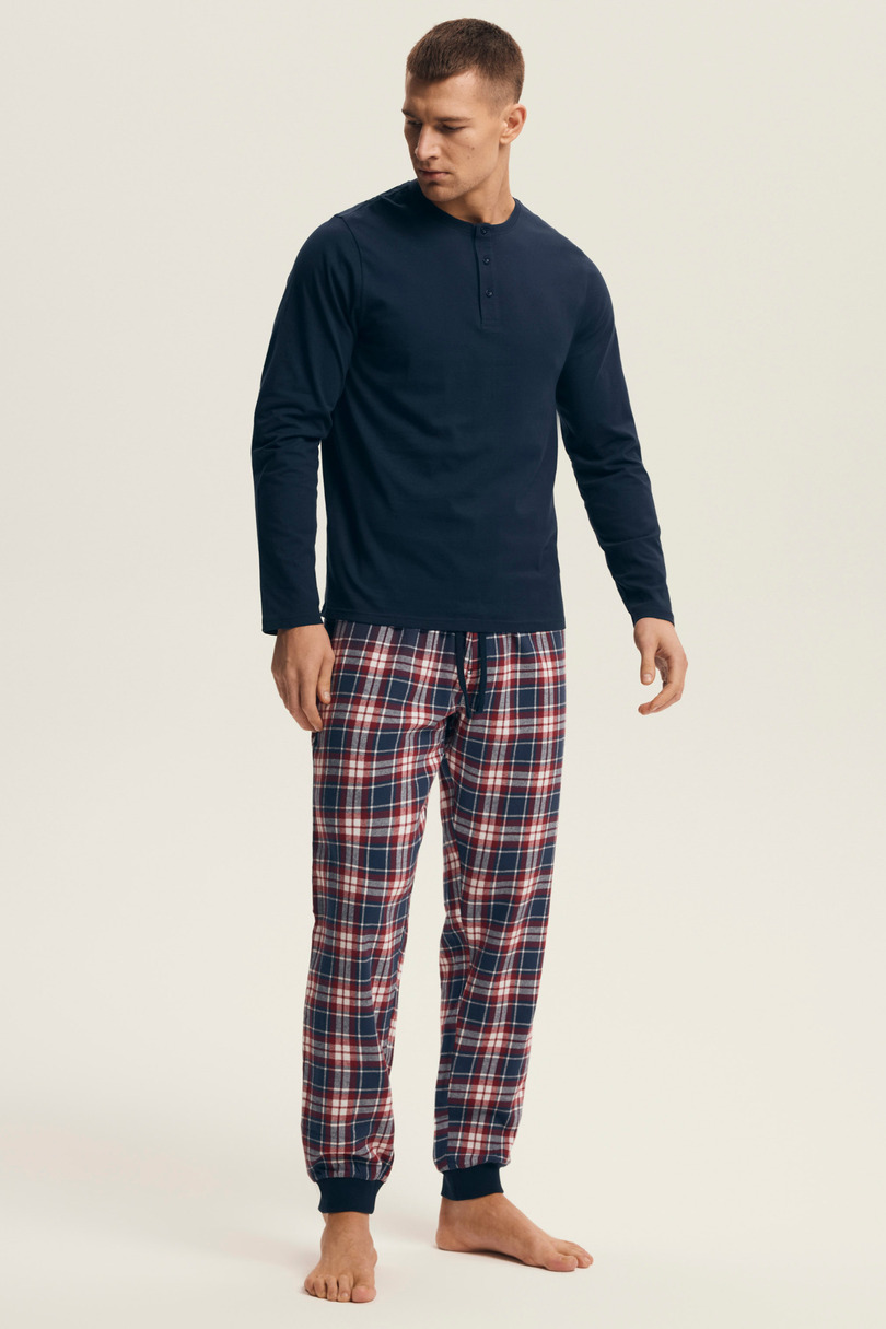 Piżama męska NOIR 43457 to ponadczasowa propozycja na chłodniejsze wieczory. Góra z długim rękawem i zapięciem na guziki typu henley w granatowym kolorze doskonale współgra z klasycznymi spodniami w czerwono-granatową kratę. Wykonana w 100% z wysokiej jakości bawełny, zapewnia komfort termiczny i przewiewność. Elastyczna talia ze sznurkiem i ściągacze w nogawkach sprawiają, że piżama idealnie dopasowuje się do sylwetki.