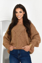 Sweter Gwen o kroju oversize z dekoltem w serek i ażurowym wzorem. Wykonany z miękkiej przędzy (55% akryl, 18% wełna, 20% poliester, 7% poliamid). Nie gryzie, idealny na chłodniejsze dni.