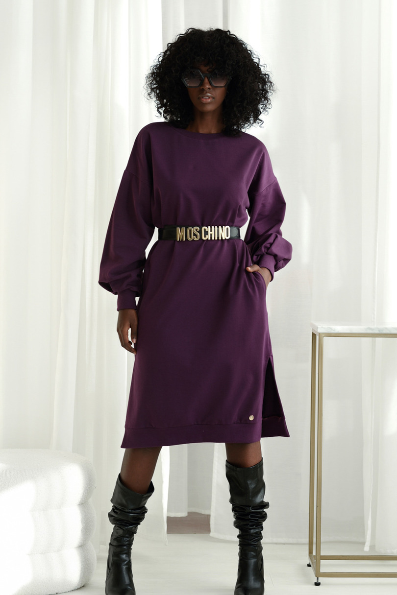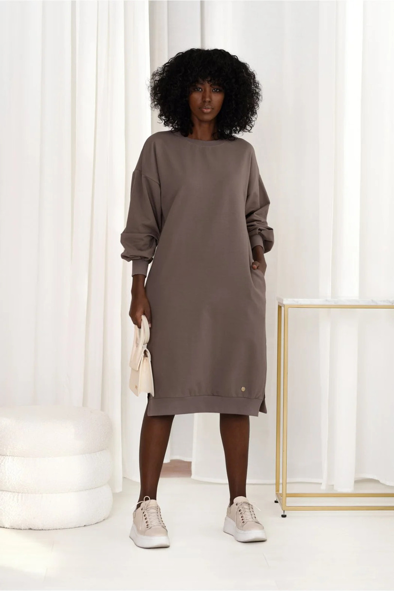 Wygodna sukienka dresowa o swobodnym, oversize’owym kroju stworzona dla kobiet ceniących komfort i nowoczesny styl. Miękka dzianina otula sylwetkę, zapewniając pełną swobodę ruchów, a subtelne rozcięcia po bokach dodają lekkości i podkreślają modny, casualowy charakter modelu. Praktyczne kieszenie ukryte w szwach pozostają niemal niewidoczne, dzięki czemu sukienka zachowuje minimalistyczną formę. Rękawy oraz dół wykończone elastycznymi ściągaczami nadają całości sportowego wyrazu. To uniwersalny model, który świetnie sprawdzi się zarówno na co dzień, jak i w wygodnych, miejskich stylizacjach.