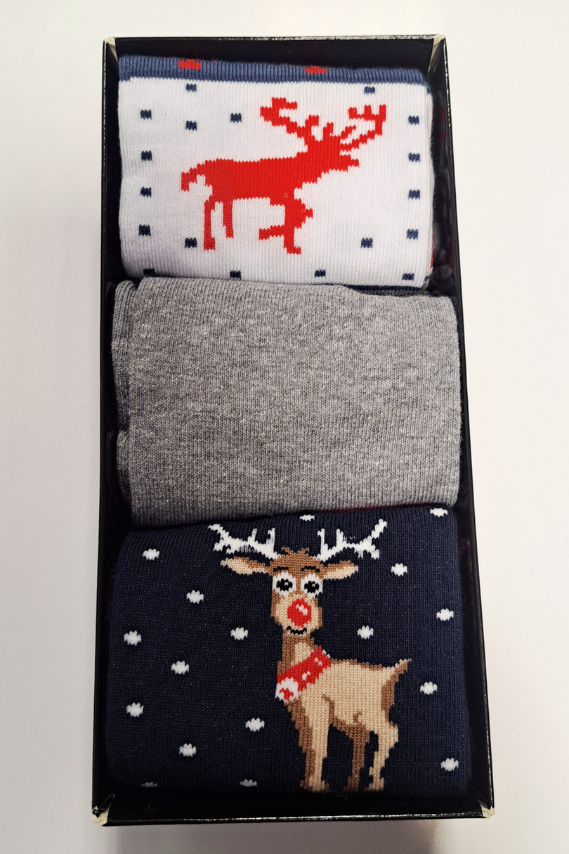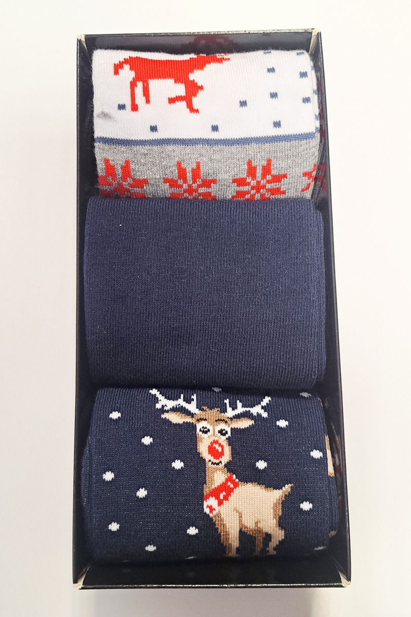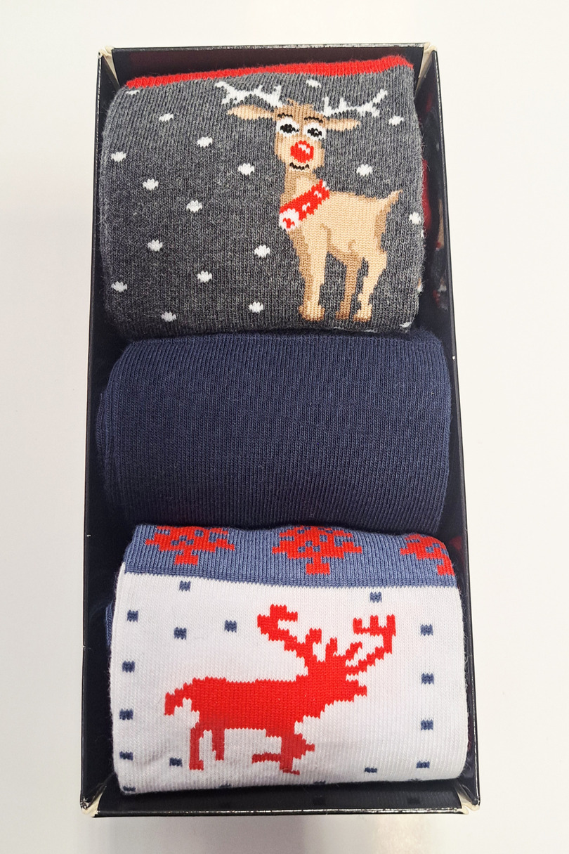 Męski zestaw świąteczny – 3 pary skarpetek: dwie w wesołe, świąteczne wzory i jedna klasyczna, gładka para garniturowa. Idealne na prezent i do codziennych zimowych stylizacji.
