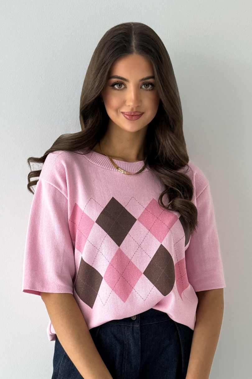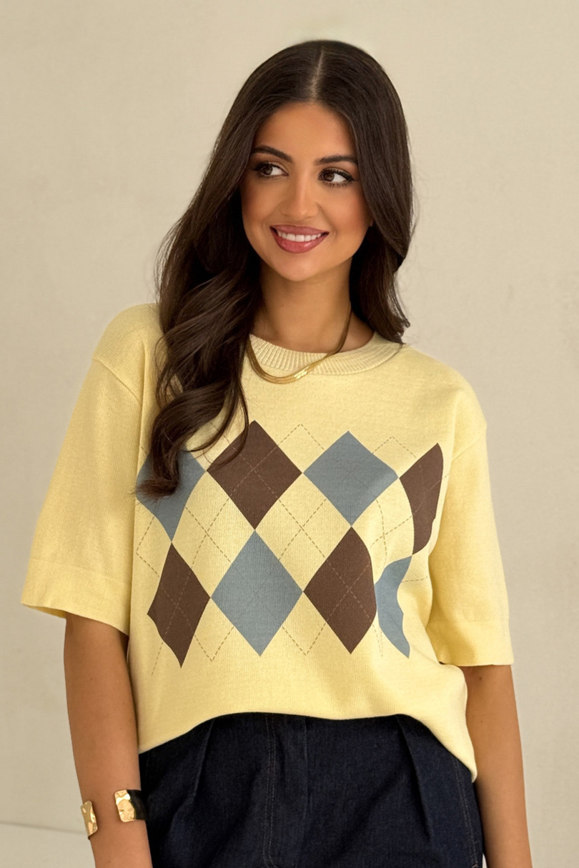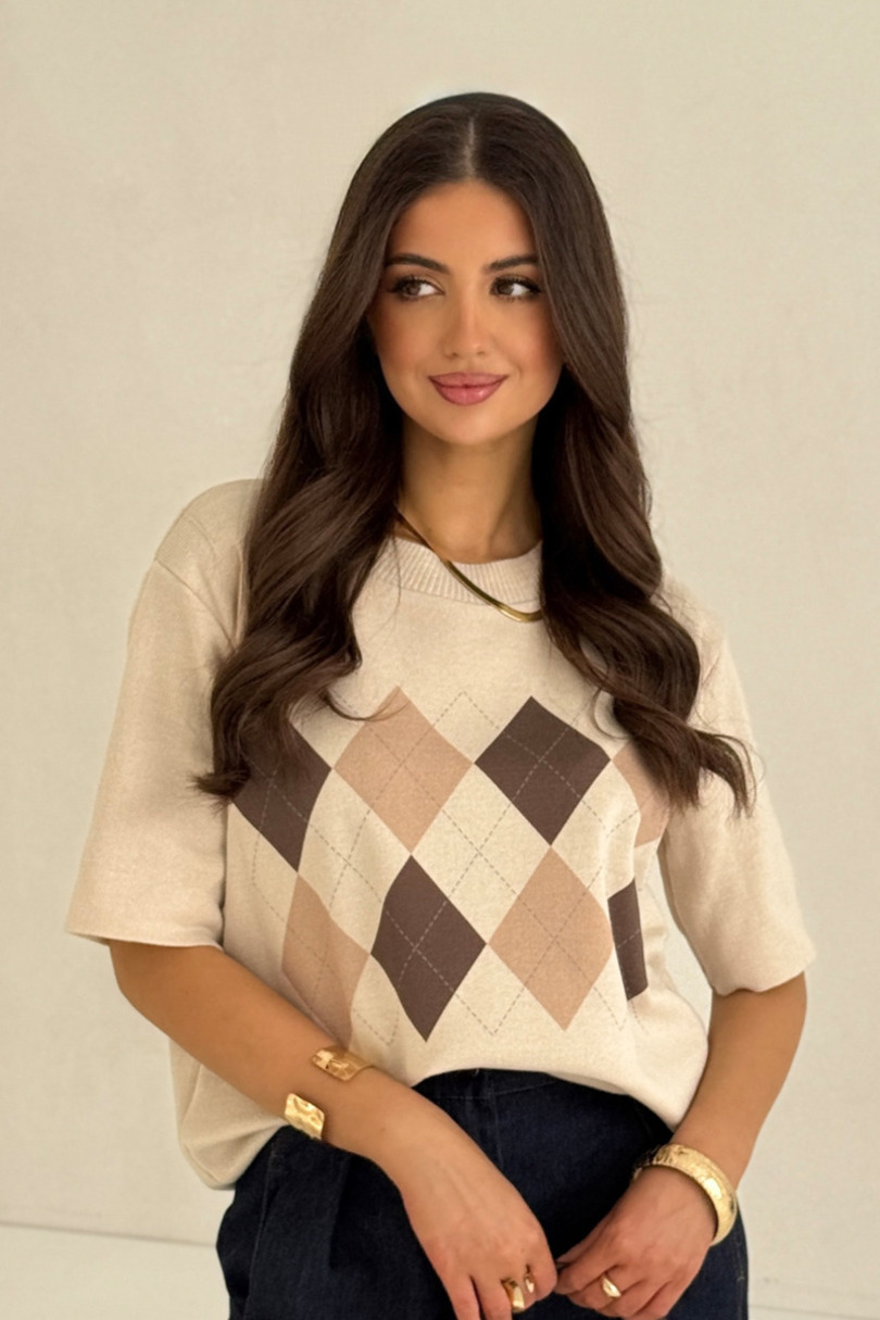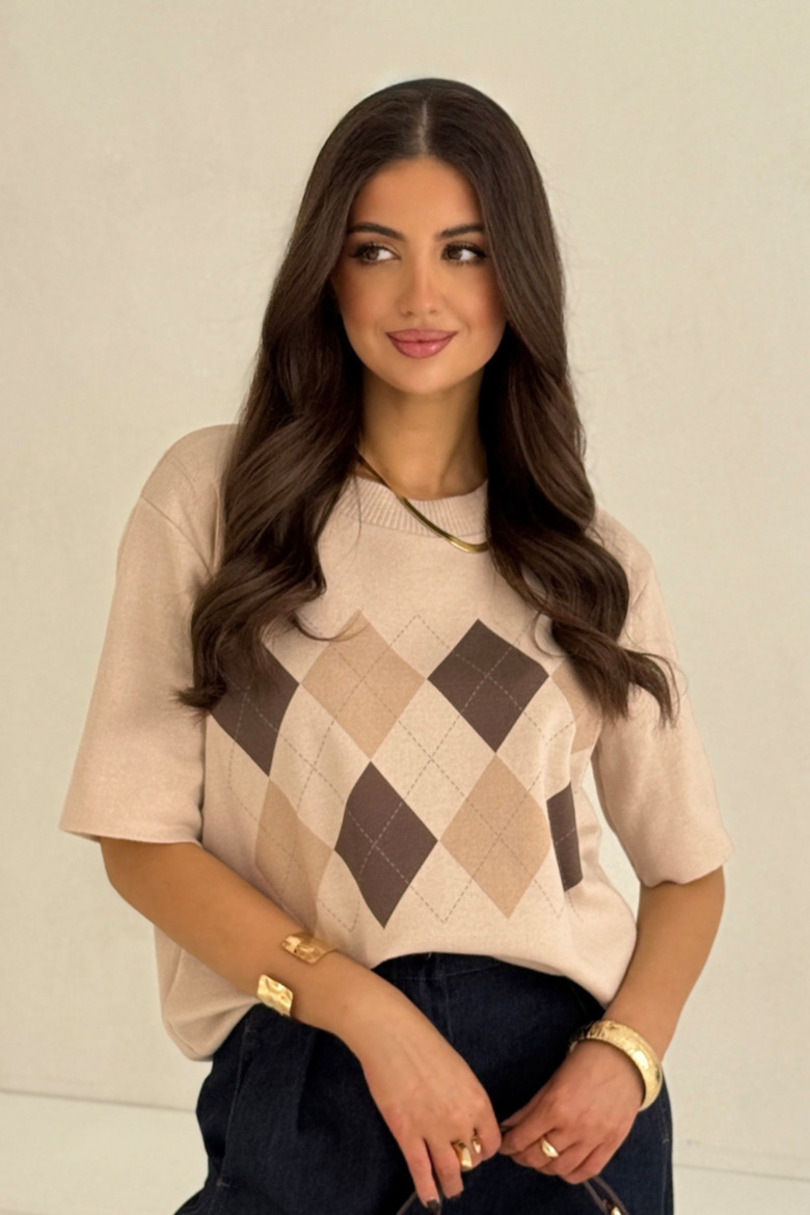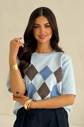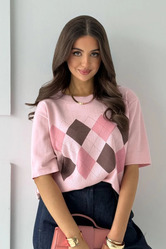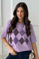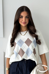 Klasyczny sweter damski z krótkim rękawem i modnym wzorem w romby. Wykonany z miękkiej mieszanki bawełny i akrylu, idealny do eleganckich i codziennych stylizacji.