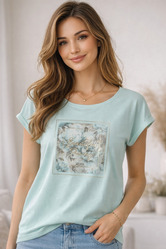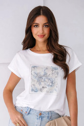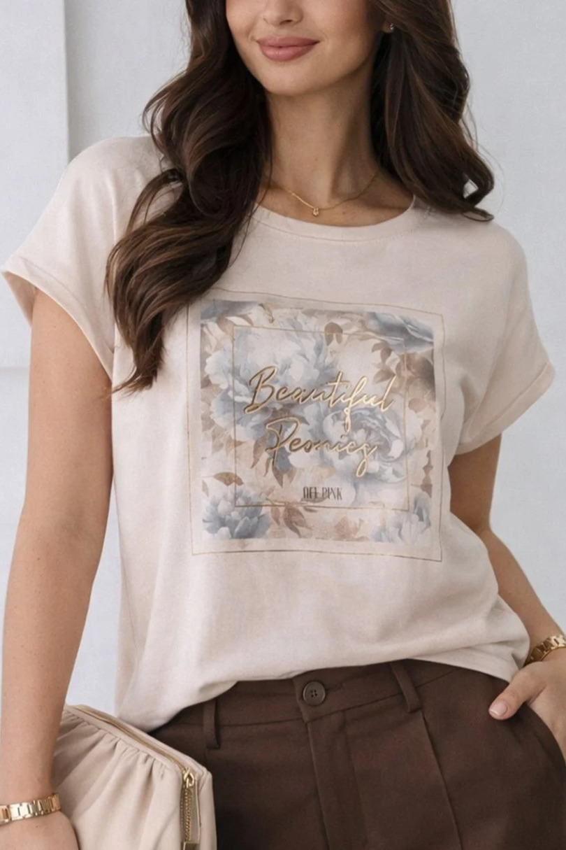 Stylowa damska bluzka z kwiatowym nadrukiem to idealna propozycja dla kobiet, które cenią połączenie wygody, elegancji i ponadczasowego stylu. Luźniejszy krój sprawia, że bluzka pięknie układa się na sylwetce, zapewnia swobodę ruchów i komfort noszenia przez cały dzień. To model, który doskonale sprawdzi się zarówno w codziennych stylizacjach, jak i podczas bardziej eleganckich okazji. Na uwagę zasługuje efektowny nadruk z motywem kwiatowym umieszczony na przodzie, wzbogacony subtelnymi złotymi detalami. Dzięki temu bluzka zyskuje kobiecy i elegancki charakter, który przyciąga spojrzenia i dodaje stylizacji wyjątkowego wyrazu. Miękki, przyjemny w dotyku materiał zwiększa komfort użytkowania i sprawia, że model świetnie nadaje się do noszenia przez wiele godzin. Krótkie, lekko podwinięte rękawy oraz klasyczny okrągły dekolt podkreślają uniwersalność fasonu. Bluzka damska z kwiatowym wzorem świetnie komponuje się z jeansami, legginsami, spodniami materiałowymi oraz spódnicami, dzięki czemu bez trudu stworzysz z nią zarówno casualowy, jak i bardziej szykowny outfit. To doskonały wybór na co dzień, do pracy, na spotkanie z przyjaciółmi czy rodzinny obiad. Jeśli szukasz modnej bluzki damskiej, która łączy komfort, kobiecy design i uniwersalność, ten model będzie doskonałym uzupełnieniem Twojej garderoby.