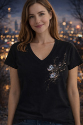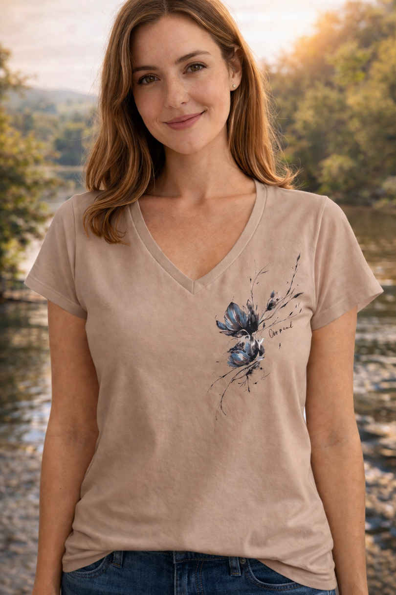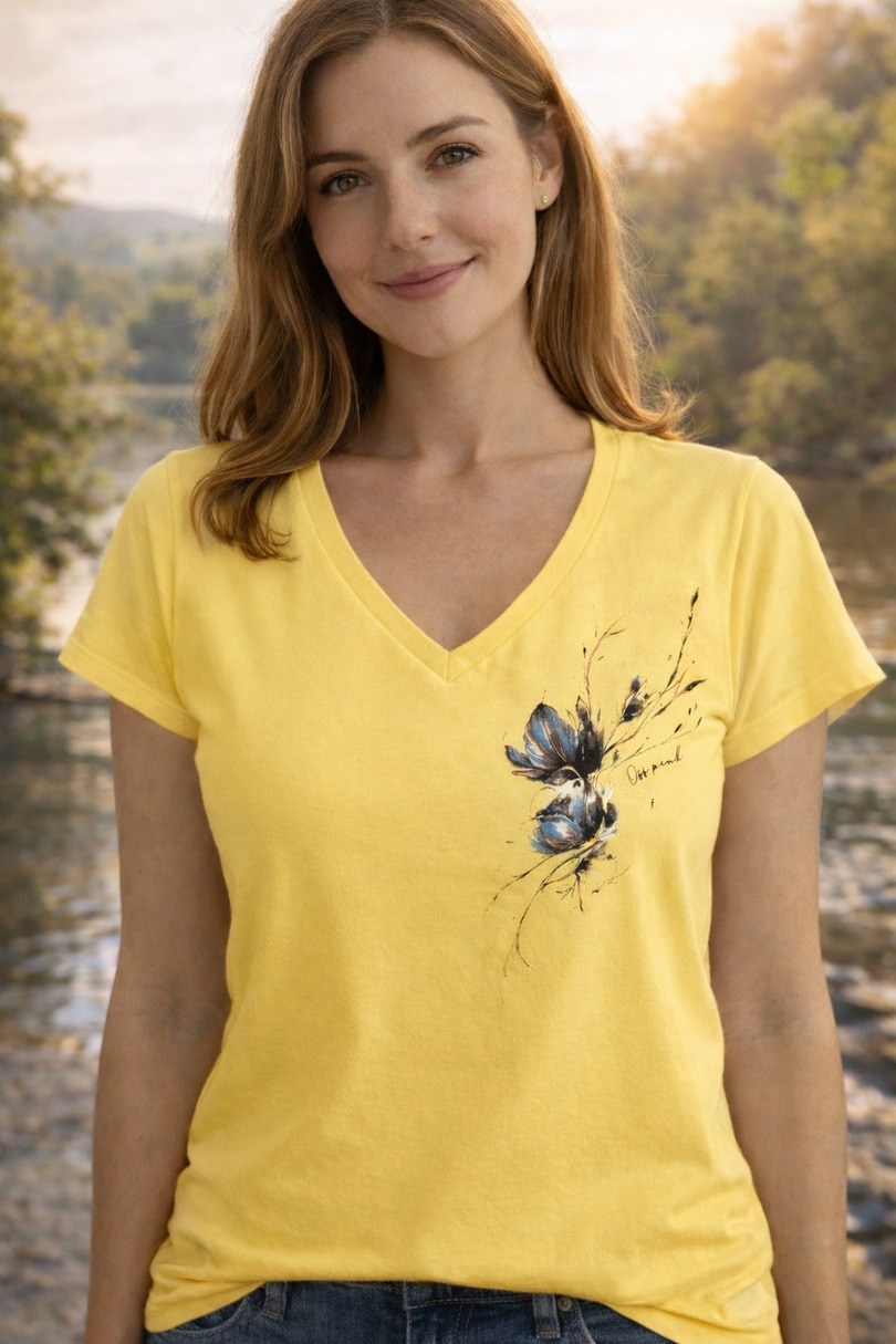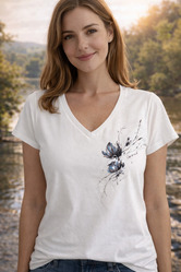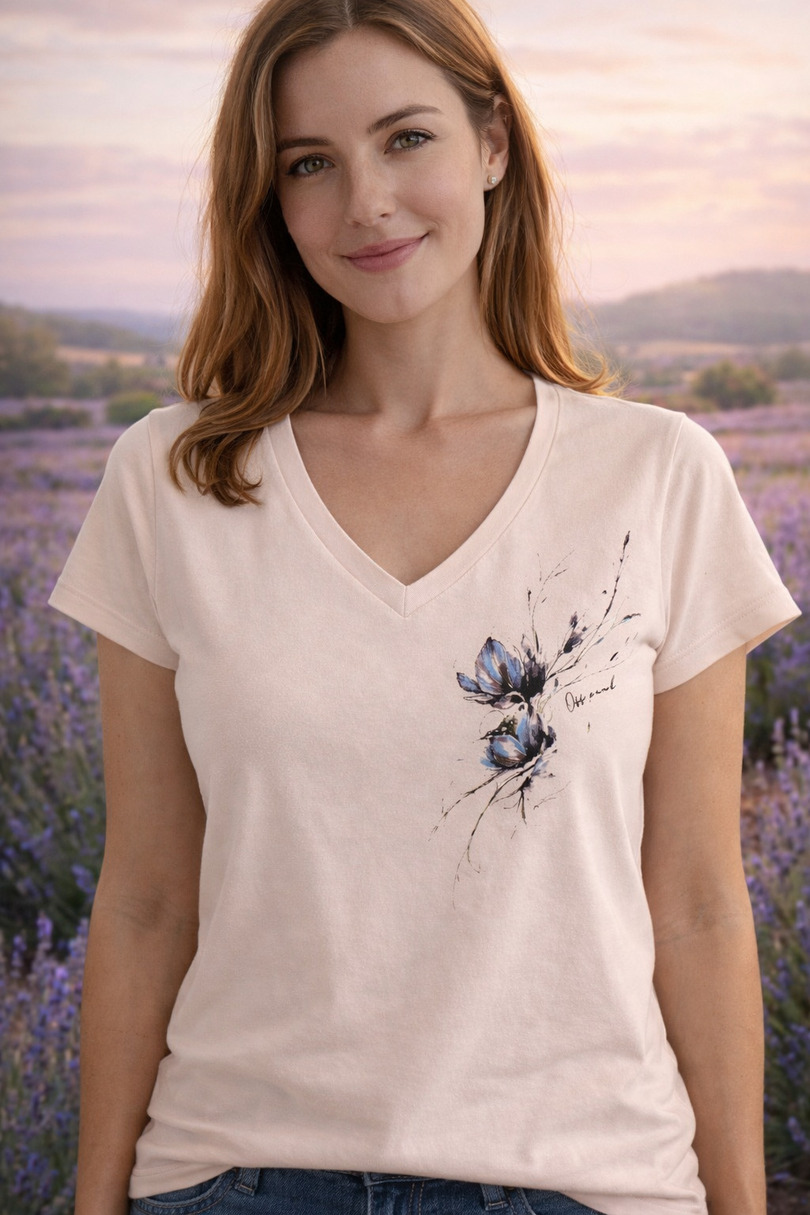 Damska bluzka z krótkim rękawem, dekoltem w serek i kwiatowym nadrukiem. Wykonana z bawełny z dodatkiem elastanu – wygodna i dopasowana do sylwetki.