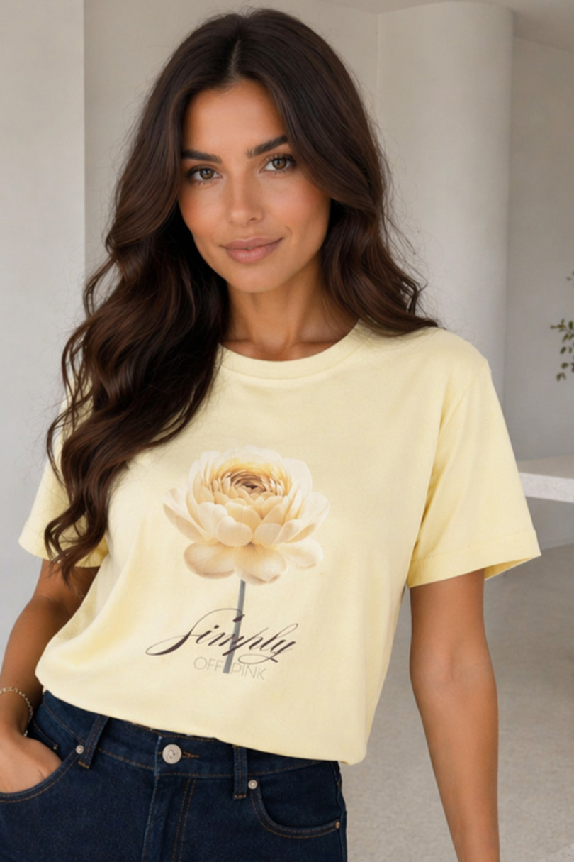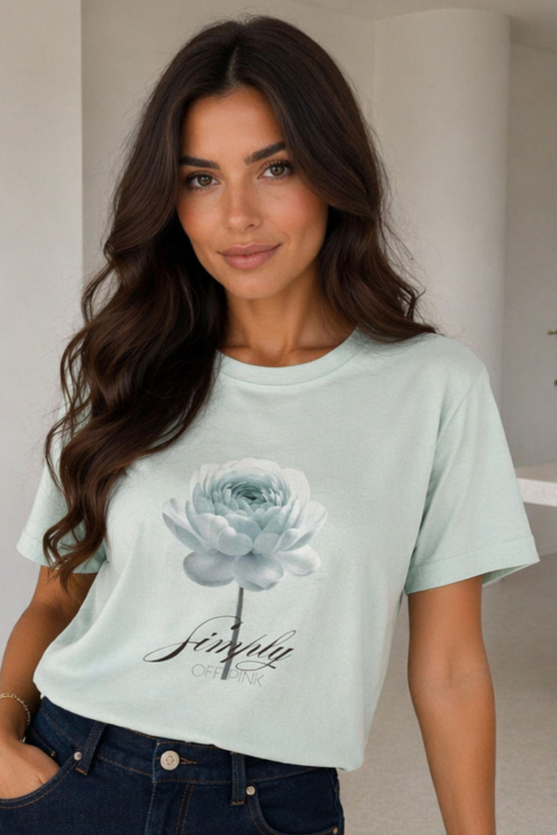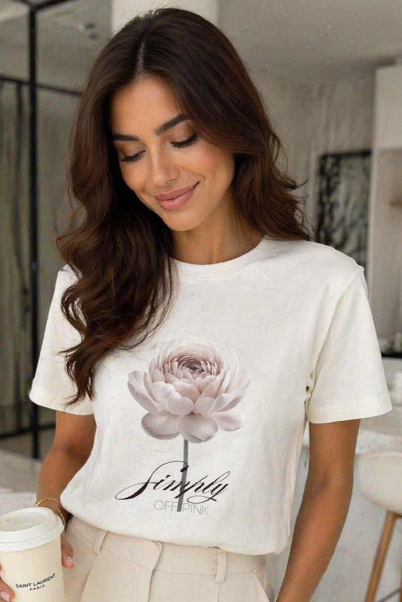 Stylowa damska koszulka z subtelnym motywem kwiatowym to doskonały wybór dla kobiet, które cenią połączenie wygody, elegancji i ponadczasowego stylu. Uszyta z miękkiej, przyjemnej w dotyku bawełny, zapewnia komfort noszenia przez cały dzień i sprawdza się zarówno na co dzień, jak i w bardziej dopracowanych stylizacjach.Klasyczny fason z krótkim rękawem oraz okrągłym dekoltem dobrze układa się na sylwetce i daje wiele możliwości stylizacyjnych. Delikatny nadruk na przodzie, przedstawiający kwiat w jasnych, pudrowych odcieniach, został uzupełniony subtelnym napisem, który nadaje koszulce lekkości, kobiecego charakteru i romantycznego wyrazu.Ta bawełniana koszulka damska świetnie komponuje się z eleganckimi spodniami, jeansami oraz spódnicą. To uniwersalny element garderoby, który podkreśli Twój styl i doda każdej stylizacji delikatnej, modnej nuty.