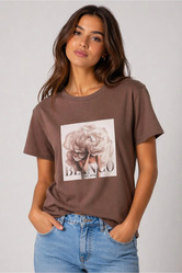 Stylowy T-shirt z kwiatowym nadrukiem i eleganckim napisem. Wykonany z miękkiej bawełny, zapewnia komfort i świetnie pasuje do codziennych oraz bardziej eleganckich stylizacji.