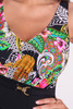Jednoczęściowy kostium kąpielowy z tropikalnym printem, dekoltem w „V” i marszczeniem w talii. Stylowy i wygodny model bez fiszbin.
