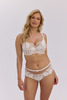 Koronkowe figi ecru z siateczką w odcieniu mokka – kobiecy, elegancki model o zmysłowym charakterze.