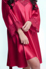 Krótki czerwony szlafrok z satyny z koronkowymi rękawami, wiązany w pasie – elegancki, zmysłowy i niezwykle komfortowy.